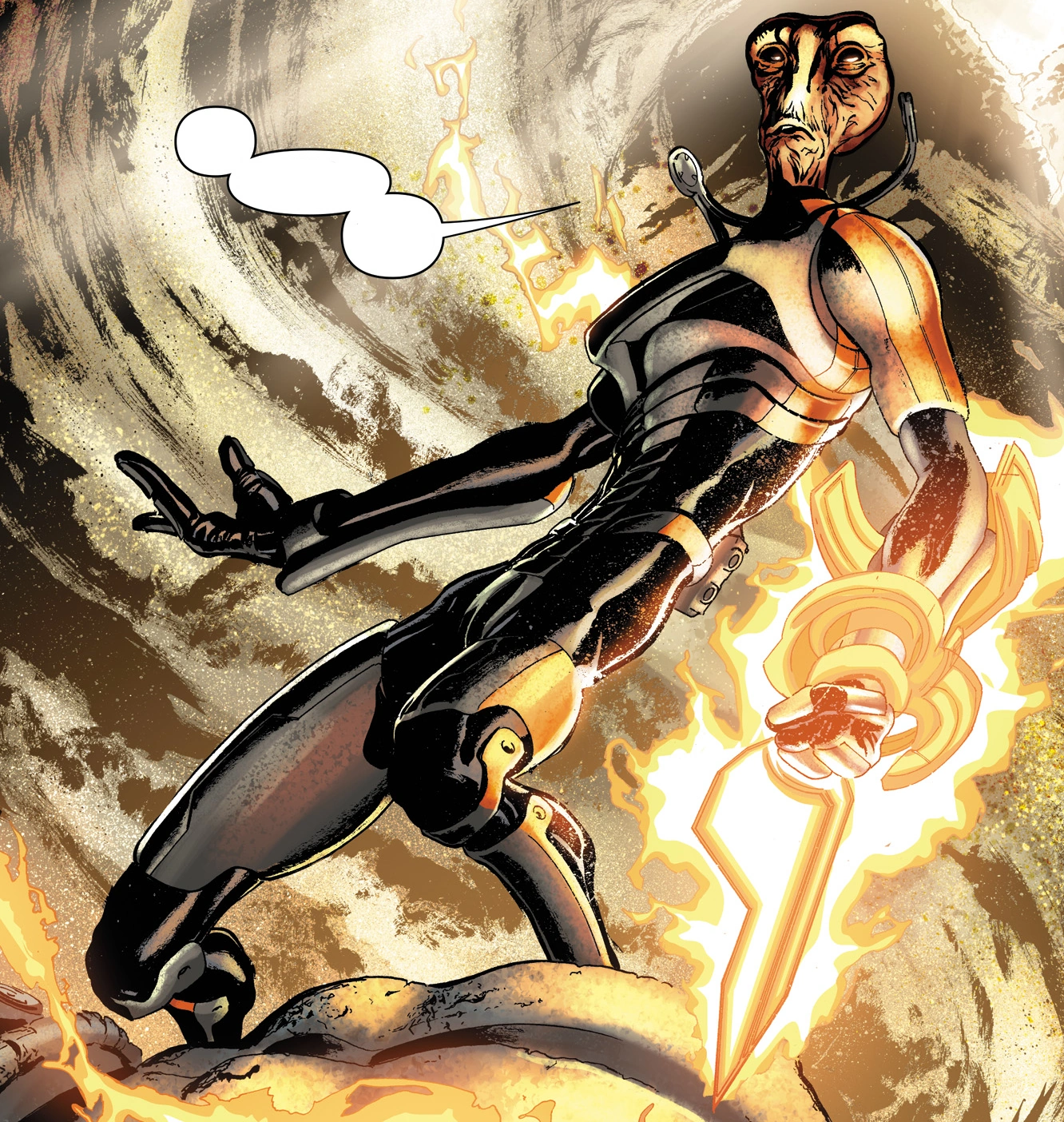 Shepard first meets the fast-talking salarian on Omega, where he is working on a cure for a bioengineered plague affecting the station, which Mordin identifies is of Collector origin. The plague has wiped out much of the Blue Suns forces, who maintained order in the district, allowing the resident vorcha, who themselves work distributing the plague for the Collectors, to make a push against them.When the vorcha deactivate environmental systems for the district in which they are located, Mordin gives Shepard a cure for the plague as well as a weapon taken off of a dead Blue Suns mercenary as a "bonus, in good faith" and tasks the Commander with reactivating the power to the environmental systems. He also requests that Shepard find Dr. Daniel Abrams, one of his assistants who entered vorcha territory searching for plague victims but hasn't returned.